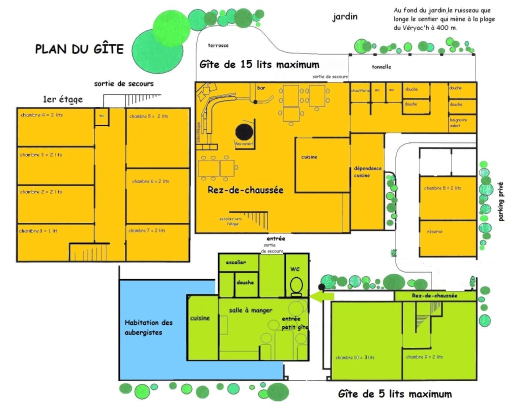 Le grand gîte comprend un total de 15 lits, répartis en 8 petites chambres avec lavabos (dont 1 au rez-de-chaussée). La salle à manger offre un coin bibliothèque où une bouée métallique a été transformée en feu ouvert. La cuisine, lieu de vie par excellence, est ouverte sur la salle par ses passe-plats voûtés. Les sanitaires, qui comprennent 4 cabines de douche et une petite baignoire, se trouvent au rez-de-chaussée. Sur la terrasse, la vigne s’épanouit sous la tonnelle qui accueille quelquefois un barbecue de poissons.